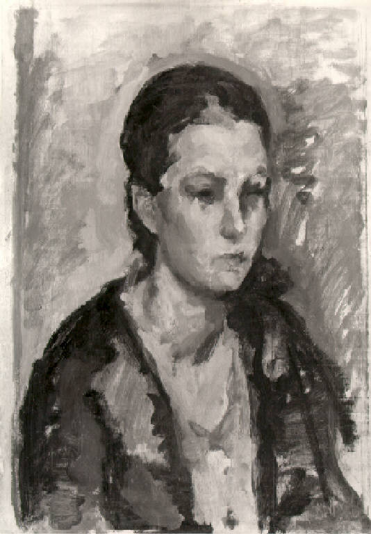 Figura femminile a mezzo busto, volta verso destra, i capelli raccolti sulla nuca.