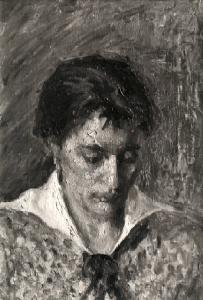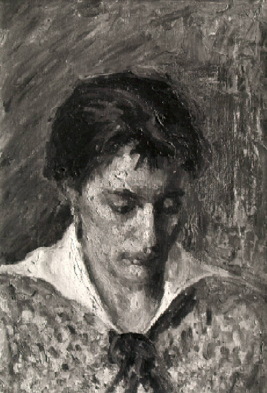 Busto di donna volta leggermente verso destra, che tiene lo sguardo rivolto verso il basso; ha i capelli raccolti ed indossa una veste con colletto a bavero chiuso da un piccolo nastro.