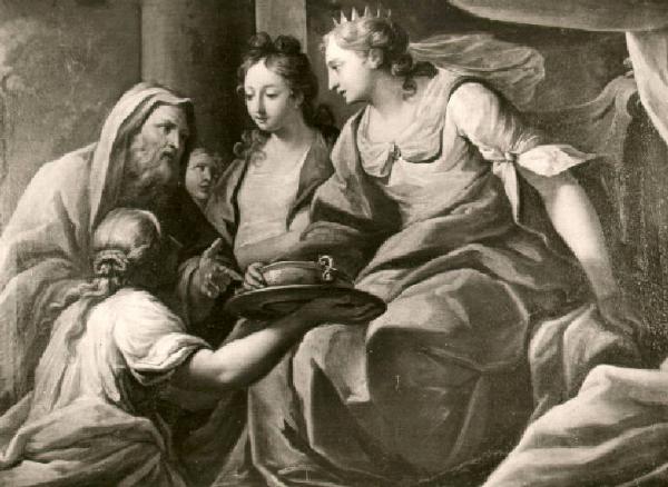 A destra, seduta in trono, la regina di Saba riceve l'offerta da una giovane donna inginocchiata davanti a lei, che solleva un piatto con bacile di metallo, e che è presentata da un vecchio con barba e testa velata. In secondo piano, a fianco della regina, altra giovane donna ed in terzo piano si intravede il volto di un'altra figura.