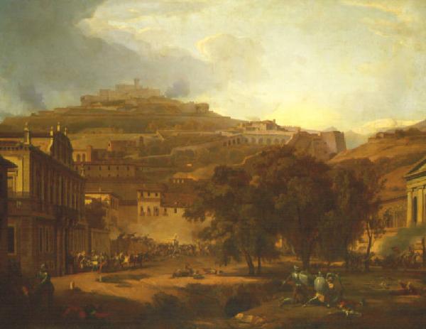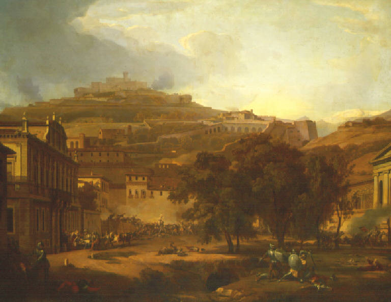 In primo piano degli armati combattono su una larga piazza; a sinistra Baiardo, in barella, è accolto da una donna sulla soglia di un palazzo; sullo sfondo il colle Cidneo e il fumo dei combattimenti.