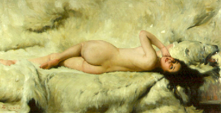 Giovane donna nuda sdraiata di spalle su una pelle d'orso, volge il capo verso il riguardante, tenendo il braccio sinistro leggermente sollevato; i lunghi capelli neri ricadono verso terra.