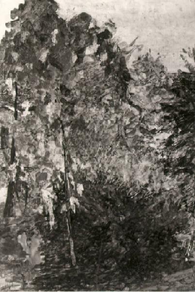 Giardino con fitta vegetazione e alti alberi.