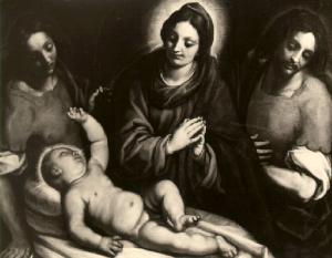 Al centro la Madonna, in piedi e con le mani giunte, volge lo sguardo a Gesù Bambino sdraiato in primo piano su un panno, il braccio sinistro alzato; a sinistra, giovane santo martire (San Giovita?), che tiene nella sinistra un ramo di palma, si sporge in avanti ad ammirare il Bambino; a destra, in posizione speculare, santo barbuto (San Faustino) con le mani appoggiate al petto e ramo di palma.
