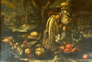 Uomo vecchio con barba sdraiato a terra, ottenuto con frutta e verdura di stagione, rappresenta l'Inverno che si appoggia al gomito sinistro e si scalda le mani presso una fascina; in primo piano recipiente in metallo con primizie; in secondo piano casolare fra alberi e paesaggio sullo sfondo.\n.