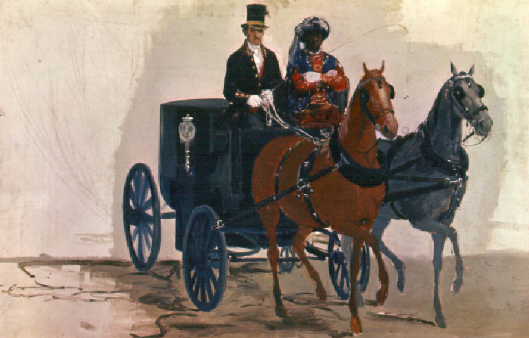 Una carrozza con tiro a due cavalli avanza da sinistra, a cassetta stanno seduti un cocchiere in serpa affiancato da un uomo di colore in abiti arabi.