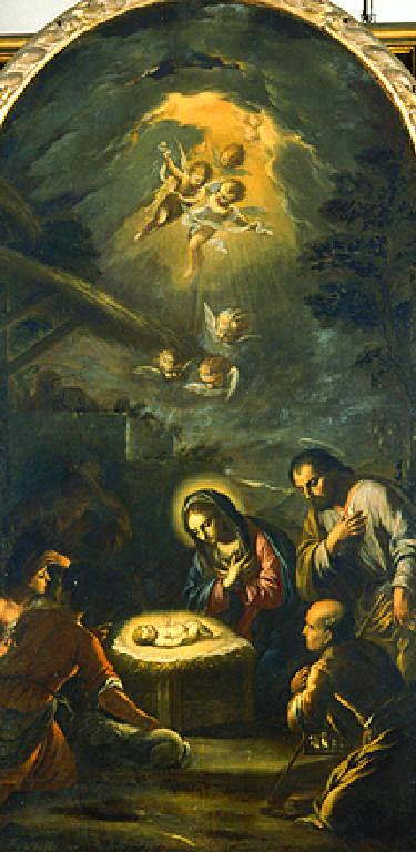Il piccolo Gesù Bambino è disteso su un cassone coperto di fieno ed emana una luce che illumina i personaggi inginocchiati in adorazione attorno a Lui: a destra, la Madonna e San Giuseppe e, in primo piano, un pastore; a sinistra, altri tre pastori, mentre sul fondo si scorgono le sagome del bue e dell'asinello; a destra, lato della capanna e, più indietro, muro dal quale si sporge un altro personaggio; nel cielo, angeli in volo che reggono un cartiglio e cherubini.