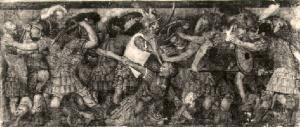 Un gruppo di guerrieri, armati con corazze, elmi, scudi e spade, combatte violentemente fra cadaveri in terra.