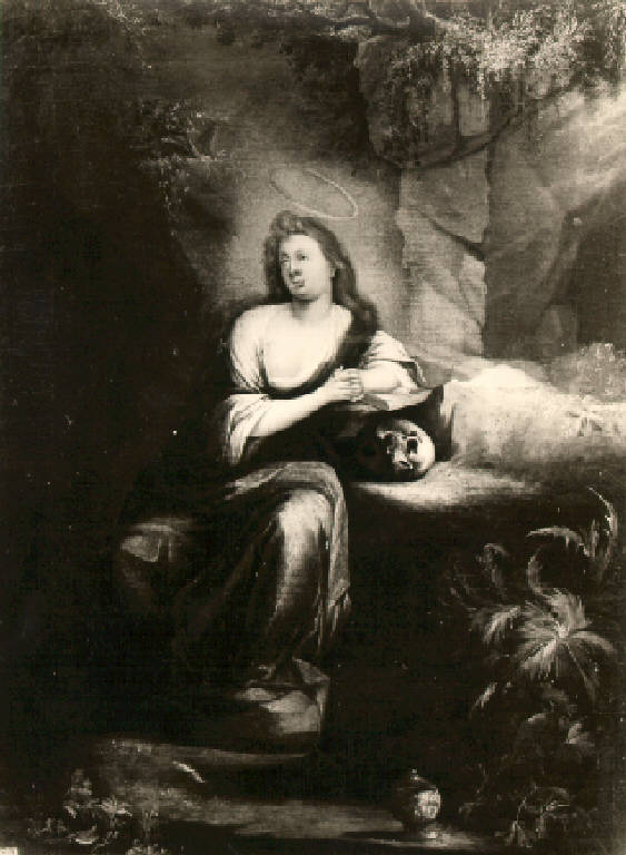 Al centro, seduta davanti a delle rocce coperte da vegetazione, la Maddalena penitente ha le mani giunte e si appoggia sul gomito sinistro sotto il quale sono un libro ed un teschio. In basso a destra piccolo vaso.