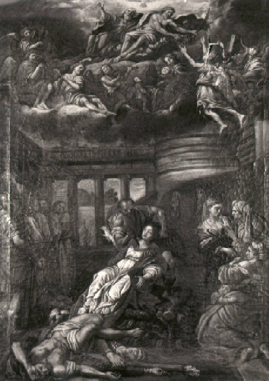 In basso, in primo piano, una figura maschile seminuda giace esanime sul corpo di un soldato morto e dietro si scorge un agnello; in secondo piano, al centro, una giovane martire viene colpita al petto da un carnefice che, trattenendola per i capelli la trascina verso la pira; a sinistra, gruppo di figure in piedi, tra cui si riconosce un soldato romano, mentre a destra personaggi femminili commentano la scena o si ritraggono spaventati. La scena si svolge entro un'elaborata architettura di sapore classico, con colonnato ionico, al di sopra della quale tra le nubi, si trova una schiera di angeli musicanti e, più sopra, Dio Padre, il braccio destro alzato, la colomba dello Spirito Santo e Gesù, che porge ad un angelo in volo una corona di fiori e la palma del martirio.