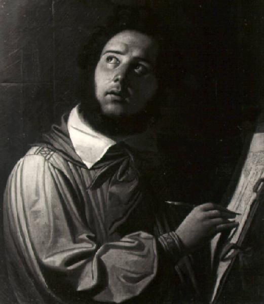 Un giovane uomo con barba nera volge il volto in alto verso sinistra e con la mano destra regge uno stilo con il quale sta disegnando su una cartella.