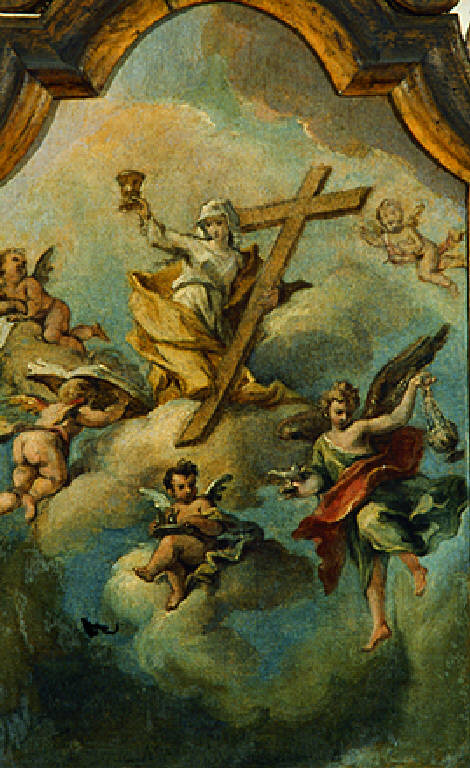 Fra le nuvole una figura con capo velato sostiene la croce con una mano, mentre con l'altra alza un calice; intorno ad essa, varie figure di angeli: uno sulla sinistra regge con entrambe le mani un libro aperto, un altro in primo piano un piccolo vassoio con ampolline, un terzo sulla destra un turibolo e una navicella per l'incenso.