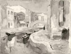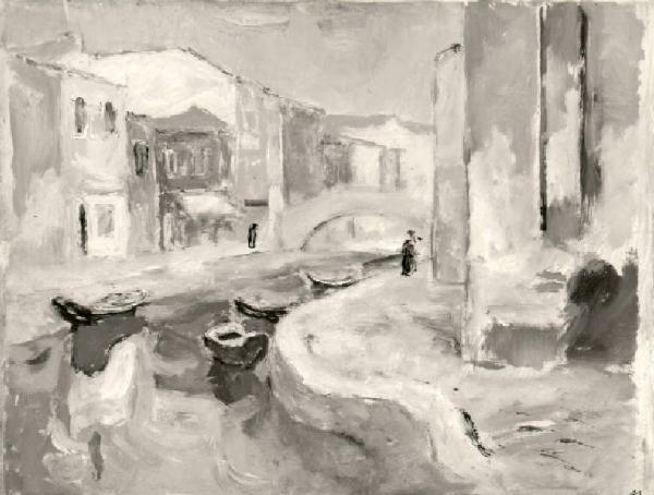 Canale a Burano costeggiato da case nei pressi della svolta di Cavanella; nello sfondo, un ponte.