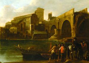 In primo piano a destra gruppo di figure in piedi e a cavallo sulla riva del Tevere vicino ad una barca. In secondo piano le arcate di un ponte rotto e, oltre il fiume, un complesso di costruzioni dominato dall'Aracoeli.\n.