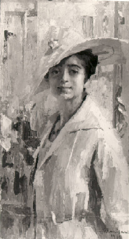 Giovane donna a mezza figura, di tre quarti col viso verso lo spettatore, indossa cappello a larga tesa ed abito bianco.
