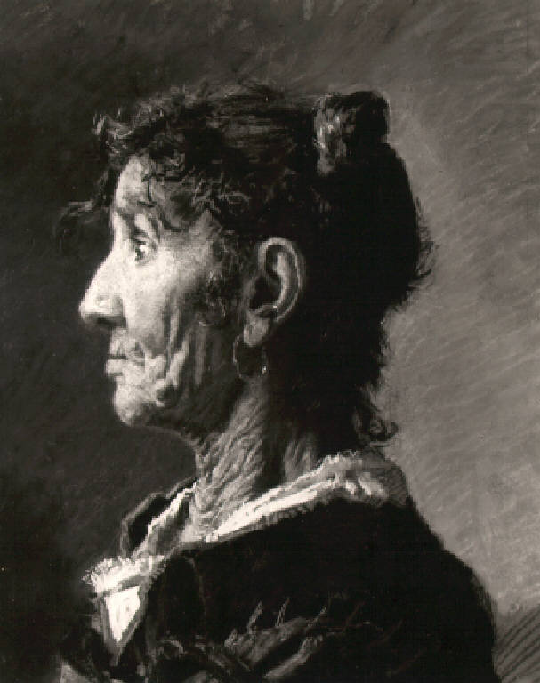 Busto di vecchia volta di profilo verso sinistra, gli occhi sgranati; tiene i capelli raccolti ai lati del viso ed indossa una camicia bianca sotto una giacca dalle spalle con impunture.