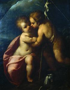 Gesù Bambino, seduto, gioca con San Giovannino raffigurato di profilo verso sinistra, che regge la croce; in primo piano a destra, l'agnello.