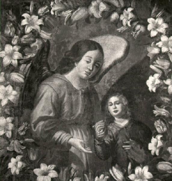 Entro una cornice di gigli ed altri fiori in bocciolo a mezza figura un angelo custode tiene per la mano un fanciullo.