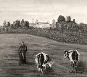 Due vacche al pascolo, in primo piano di schiena, e frate francescano in un prato; sul fondo, oltre una macchia di folta vegetazione, abbazia.