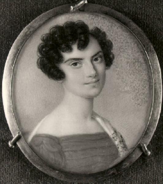 Una donna giovane con abito azzurro, le spalle scoperte, uno scialle sulla spalla sinistra.