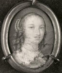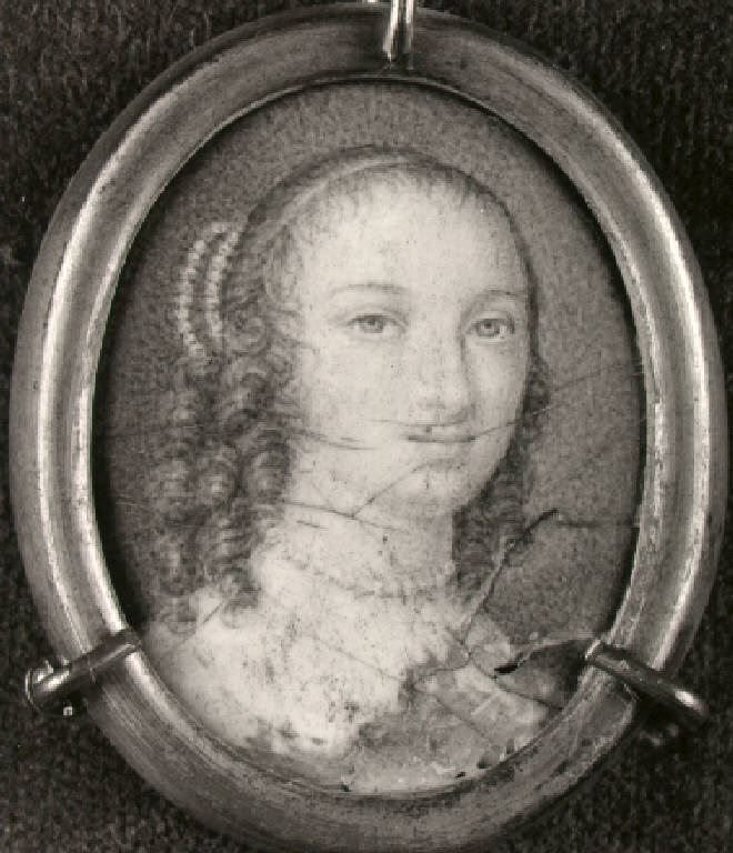 Giovane donna con collana di perle e lunghi capelli raccolti da un fermaglio circolare.