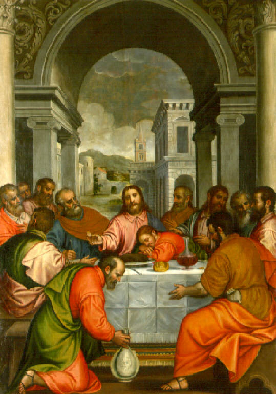 Gesù Cristo al centro, seduto ad una tavola e circondato dagli apostoli, ha nella destra l'ostia consacrata. La scena si svolge in una sala colonnata ed in secondo piano si apre un arco a tutto sesto su pilastri ionici, oltre il quale è un paesaggio con veduta di architetture urbane in prospettiva.