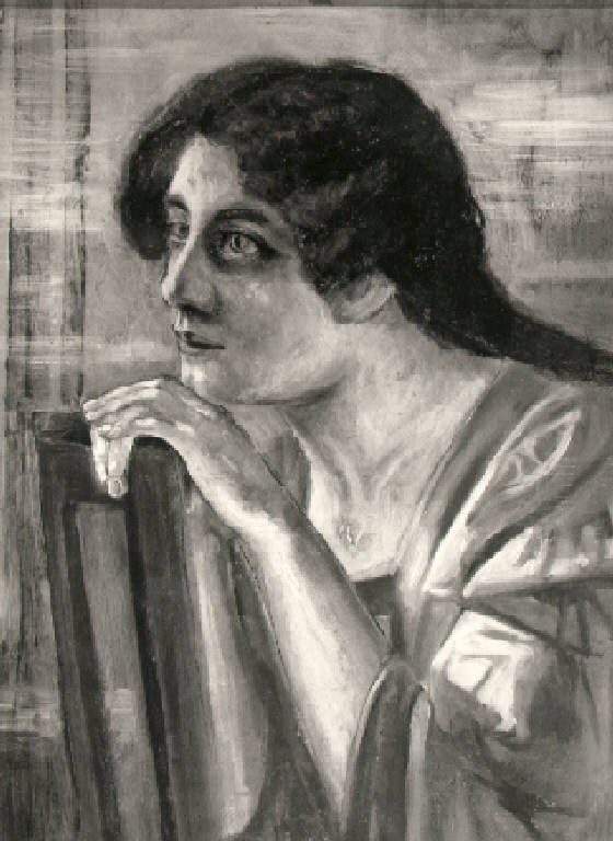 Giovane donna, ritratta a mezzo busto e volta di tre quarti verso sinistra, si appoggia con entrambe le mani allo schienale di una sedia, lo sguardo perso nel vuoto; indossa un abito dallo scollo quadrato e porta i capelli raccolti in una treccia (?) che scende lungo la schiena.