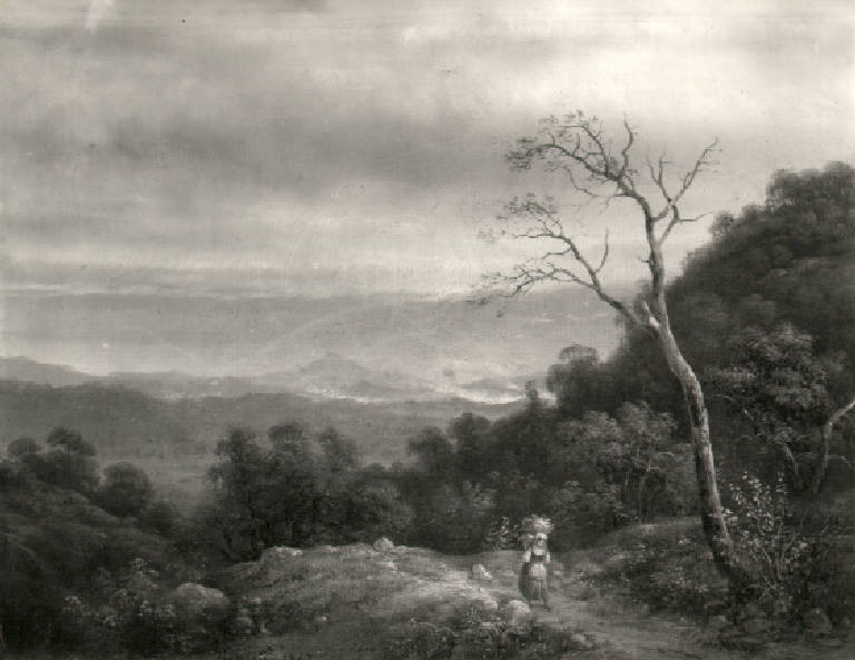 Al centro una contadina con gerla cammina su un sentiero in mezzo al bosco, sullo sfondo paesaggio con montagne avvolte nella foschia.