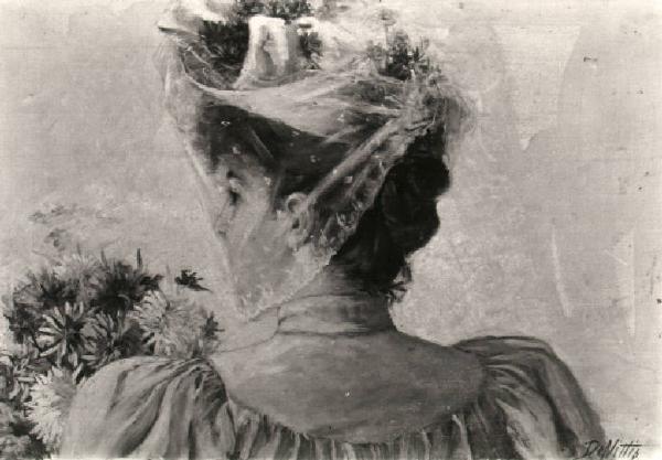 La figura è posta di spalle e volge il capo verso sinistra, indossa un cappellino ornato di fiori con veletta, mentre i capelli sono raccolti alti sulla nuca; a sinistra, si intravedono le corolle di un mazzo di fiori.