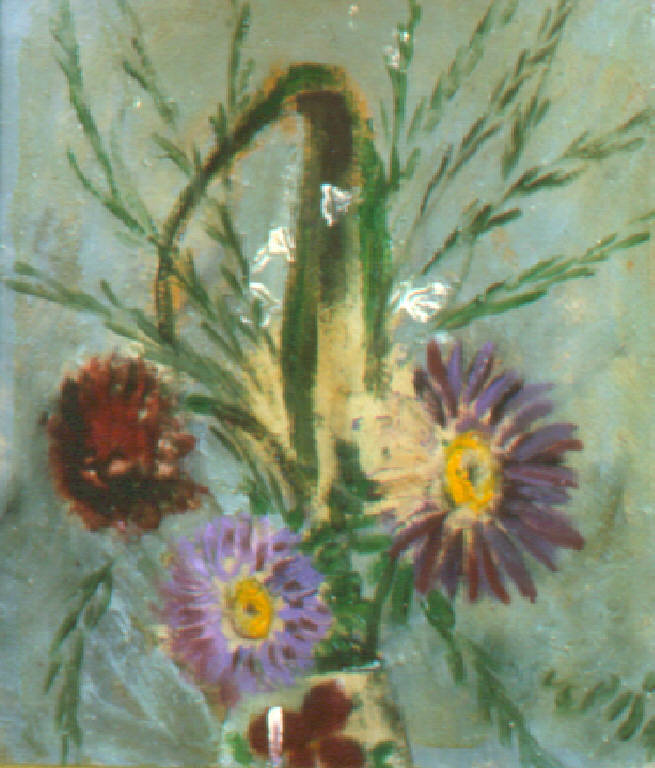 Dalla bocca circolare di un vaso spunta fiori e lunghi rami con piccole foglie.