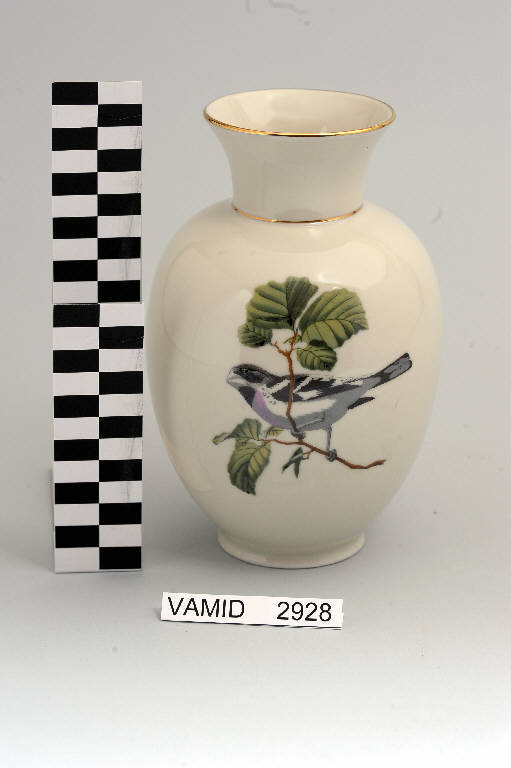 - NOTIZIE STORICO CRITICHE Il vaso, che mostra una certa eleganza nello snodarsi della forma, è decorato a decalcomania su ambo i lati con un fresco disegno naturalistico raffigurante degli uccellini appollaiati su dei rami. Fa parte di una donazione di privati al Museo. Tipologicamente si lega ad un altro vaso conservato presso il Midec (num. inv. 3385).\nIl vaso e il decoro sono presenti nel catalogo degli Articoli Fantasia dello Stabilimento Verbano della Società Ceramica Italiana con dicitura "vaso piccolo numero 33" e decoro numero 1542 (Busta 85, fascicolo 1 Archivio SCI).
