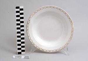 Piatto fondo circolare; fondo bianco avorio con motivo decorativo a festoni in oro lungo la tesa; bordo rifinito con filettatura oro.