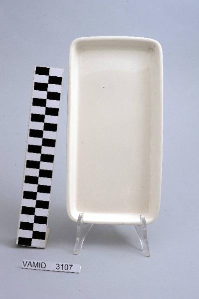 - NOTIZIE STORICO CRITICHE Il vassoio in esame, composto da sei elementi (nn. inv. 3107-3110, 3152-3153), rientra in una tipologia di vasellame di gusto corrente. La foggia semplice ed essenziale indica una evidente assimilazione dei concetti legati al funzionalismo e quindi una datazione alla metà del Novecento. La mancanza di caratteri stilistici particolari impedisce una definizione cronologica più circoscritta. Fa parte di una donazione di privati al Museo.