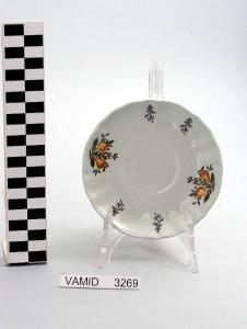 Piattino da caffè con bordo ondulato; fondo bianco con motivo decorativo vegetale policromo disposto regolarmente lungo il bordo.
