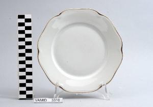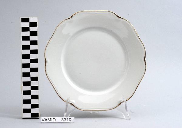 - NOTIZIE STORICO CRITICHE L'oggetto in esame, appartenente ad un servizio da tavola composto da cinquantaquattro elementi (num. inv. 3102...3565), rientra in una tipologia di vasellame di gusto popolare. Il design sobrio ed elegante, una linea ondulata e il bordo sottolineato da una filettatura oro denotano una ricerca stilistica riferibile alla metà del Novecento. La ditta produttrice, denominata "Società Ceramica del Verbano", venne fondata nel 1924 per competere con la porcellana di Doccia. Malgrado la qualità materica e formale dei suoi servizi, la "Verbano", non ebbe mai sul mercato della porcellana la potenza e l'inventiva della Ginori. Il piatto fa parte di una donazione di privati al Museo.