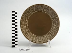 Piatto piano circolare color marrone; motivi decorativi geometrici e vegetali a rilievo lungo la tesa.