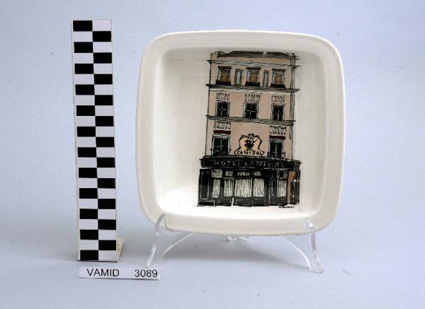 Ciotola di forma quadrata con angoli arrotondati; fondo bianco decorato con facciata di palazzo policroma.
