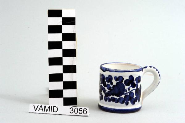 Tazzina da caffè con corpo cilindrico; manico a "C"; fondo bianco decorato con motivo floreale stilizzato in blu all'esterno; bianco internamente; bordo superiore e inferiore rifiniti in blu.
