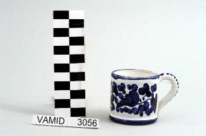 - NOTIZIE STORICO CRITICHE L'oggetto in esame, avente un decoro in blu dipinto a mano su fondo bianco, si inserisce in un filone di stoviglie e vasellame di gusto corrente. Il corpo cilindrico e il manico a "C", perfettamente funzionale alla presa, indicano una datazione ormai avanzata nel Novecento. La mancanza del marchio impedisce di risalire con esattezza alla ditta produttrice. L'oggetto è comunque attribuibile ad una generica manifattura di Deruta (cfr. l'iscrizione presente sul fondo di una tazzina e di entrambi i piattini). La tazzina, appartenente ad un servizio da caffè composto da quattro elementi (nn. inv. 3056-3059), fa parte di una donazione di privati al Museo.