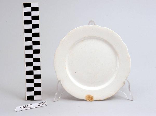 Piatto piano di colore bianco avorio; tesa con profilo ondulato.