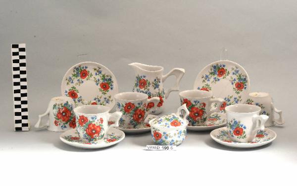 Servizio da thè composto da sei piattini, sei tazze, una zuccheriera e una lattiera