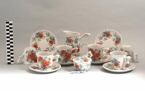 - NOTIZIE STORICO CRITICHE Il servizio da thè in esame, composto da quattordici elementi, è realizzato nella forma denominata "C 205" progettata da Antonia Campi e pubblicata tra i disegni tecnici della "S.C.I." del 1953 (cfr. E. Biffi Gentili, 1998). La decorazione floreale, resa con morbidi effetti di chiaroscuro e con una policromia ricca e sfumata realizzata con la tecnica della decalcomania soprasmalto, richiama quei decori naturalistici in voga all'inizio del secolo. Il medesimo decoro è presente su un servizio da caffè conservato presso il Midec (num. inv. 3787...3792). Il servizio fa parte di una donazione di privati al Museo.
