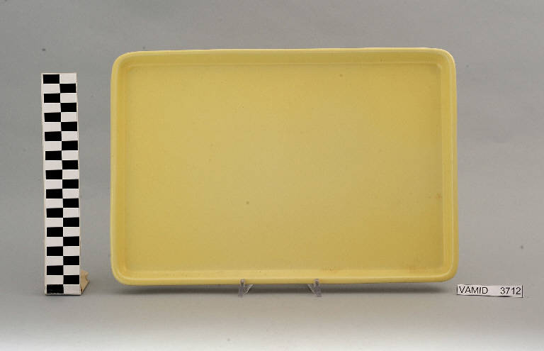 - NOTIZIE STORICO CRITICHE Il vassoio in esame rientra in una tipologia di gusto corrente. La foggia semplice ed essenziale indica una evidente assimilazione dei concetti legati al funzionalismo e quindi una datazione alla metà del Novecento. La mancanza di caratteri stilistici particolari impedisce una definizione cronologica più circoscritta. Fa parte di una donazione di privati al Museo. Nel Midec è conservato un vassio identico nella versione color bianco (num. inv. 3110).