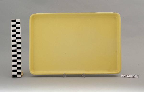 Vassoio rettangolare con bordo rialzato e angoli arrotondati; fondo giallo uniforme.