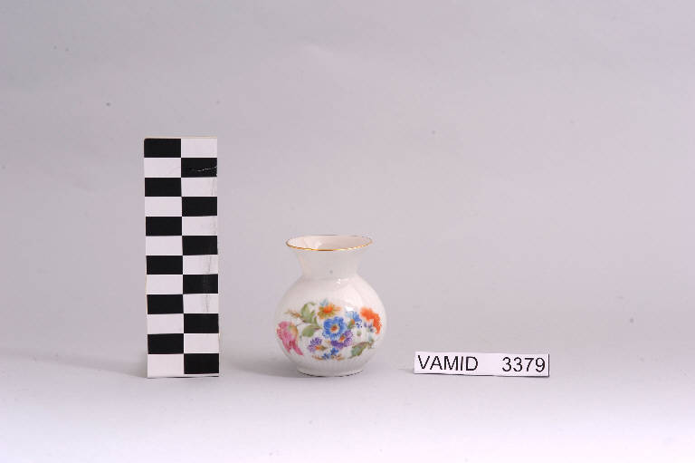 - NOTIZIE STORICO CRITICHE La foggia semplice e funzionale del vasetto in esame, forse una bomboniera, è riferibile ad una produzione di oggetti d'uso comune ormai avanzata nel Novecento. Il bouquet floreale, realizzato con la tecnica della decalcomania soprasmalto, richiama quei decori naturalistici in voga all'inizio del secolo poi ripresi tra gli anni Settanta e Ottanta. La ditta produttrice, denominata "Società Ceramica del Verbano", venne fondata nel 1924 per competere con la porcellana di Doccia. Malgrado la qualità materica e formale dei suoi servizi, la "Verbano", non ebbe mai sul mercato della porcellana la potenza della Ginori. Nel Midec sono conservati un vasetto identico (num. inv. 3381) e un posacenere, realizzato per la ICAT di Torino, con un decoro floreale molto simile (num. inv. 1491). Il vasetto fa parte di una donazione di privati al Museo.
