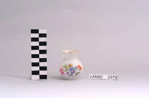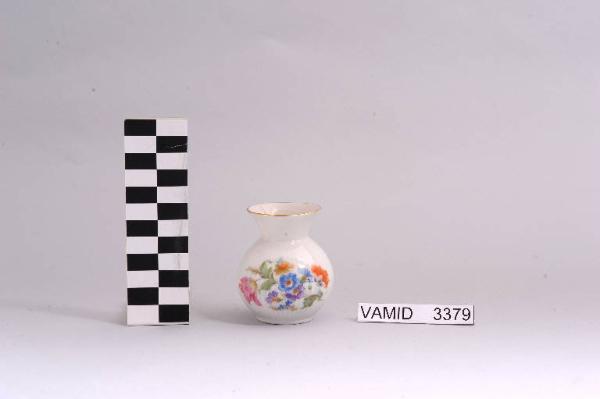 Vasetto con corpo globulare sormontato da collo corto e imboccatura leggermente svasata; fondo bianco con bouquet floreale policromo all'esterno; bordo dell'imboccatura rifinito con filettatura oro.