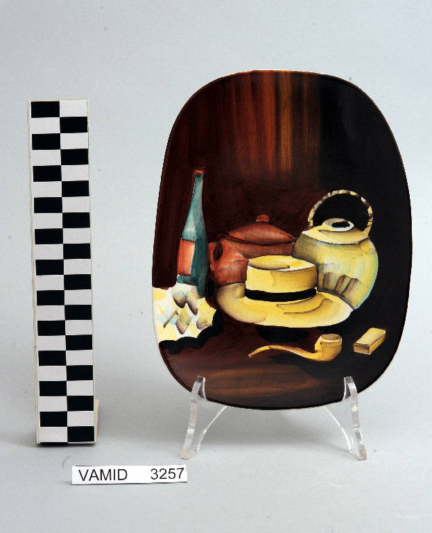 - NOTIZIE STORICO CRITICHE La foggia funzionale del piatto in esame e lo stile del decoro, una natura morta dipinta a mano con ampie pennellate e senza contorni netti, indicano una datazione ormai avanzata nel Novecento. Il manufatto, probabilmente realizzato per essere appeso a parete, fa parte di una donazione di privati al Museo. Nel Midec è conservato un piatto, prodotto sempre dalla "Ditta Deam" e dipinto a mano, con forma e soggetto diversi (num. inv. 3256).
