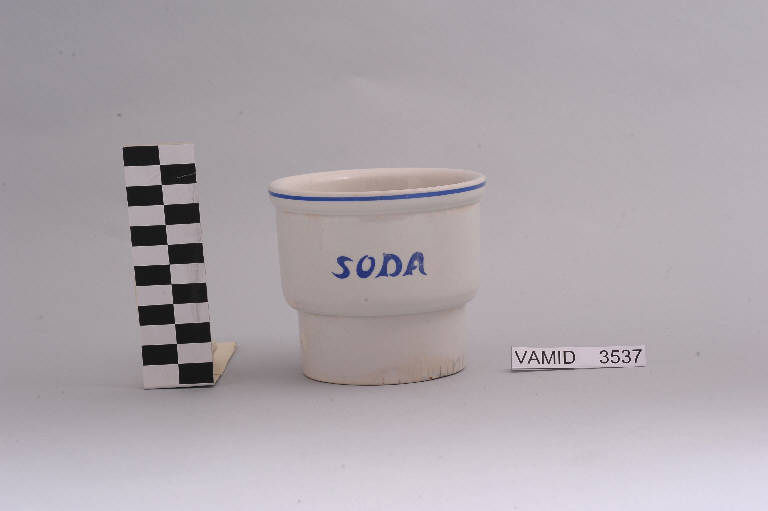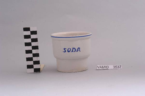 Vasetto di forma cilindrica; fondo bianco con scritta "SODA" in blu; bordo rifinito con filettatura blu.