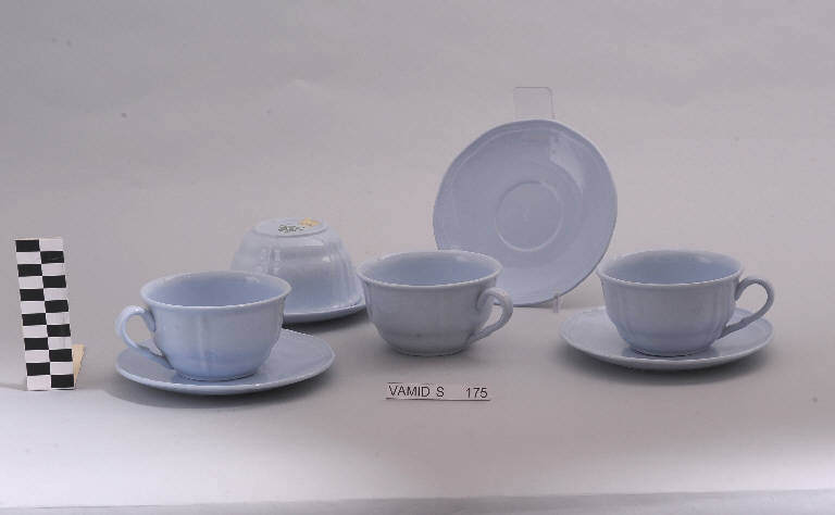 - NOTIZIE STORICO CRITICHE Il servizio in esame, composto da otto elementi (num. inv. 3613...3627), rientra in una tipologia di vasellame di gusto corrente. Il design sobrio ed elegante, la linea ondulata del bordo dei piattini e il motivo a costole verticali leggermente a rilievo delle tazze indicano una datazione alla prima metà del Novecento. La mancanza di caratteri stilistici particolari impedisce una definizione cronologica più circoscritta. Il servizio fa parte di una donazione di privati al Museo. La foggia delle tazze ricorda vagamente le forme dei servizi "Pescara" e "Vecchio Milano". Nel Midec sono conservati un piattino (num. inv. 1493) e un servizio da thè (num. inv. 3746-3770) nella variante color bianco con bordi rifiniti da leggere profilature oro e un servizio da thè (num. inv. 3615...3626) color azzurro uniforme i cui piattini presentano una forma identica a quella dei piattini del servizio in esame.