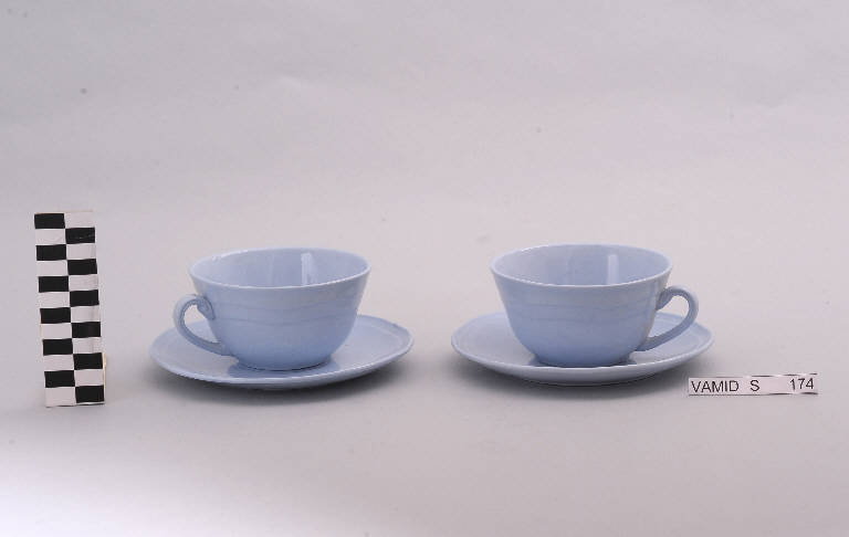 - NOTIZIE STORICO CRITICHE Il servizio in esame, composto da quattro elementi (num. inv. 3617...3626), rientra in una tipologia di vasellame di gusto corrente. Il design sobrio ed elegante, la linea ondulata del bordo dei piattini e il motivo ondulato a rilievo delle tazze indicano una datazione alla prima metà del Novecento. La mancanza di caratteri stilistici particolari impedisce una definizione cronologica più circoscritta. Il servizio fa parte di una donazione di privati al Museo. Nel Midec sono conservati un servizio da thè (num. inv. 3746-3770) identico a quello in esame nella variante color bianco con bordi rifiniti da leggere profilature oro, un piattino (num. inv. 1493), sempre nella variante color bianco con bordi rifiniti da leggere profilature oro, e un servizio da thè (num. inv. 3613...3627) color azzurro i cui piattini presentano una foggia identica a quella dei piattini del servizio in esame.