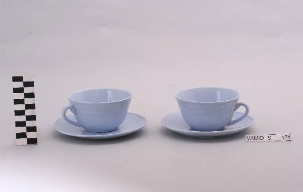Servizio da thè composto da due piattini e due tazze di color azzurro uniforme.